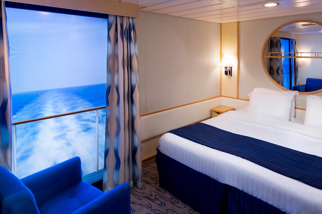The main drawbacks of inside cabins include their limited space and complete lack of natural light or ocean views. However, some cruise lines have addressed this limitation with innovative solutions – Royal Caribbean[4] offers “virtual balcony” cabins featuring floor-to-ceiling HD display screens with real-time views of the ocean and surrounding scenery. Not that that helps on a ‘scenic cruising’ day.