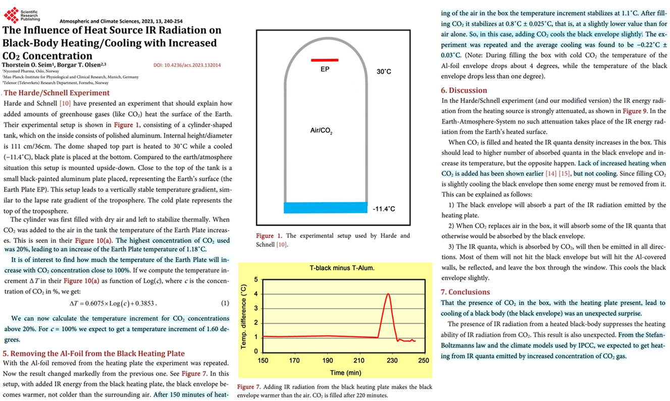 But in their 2023 paper Seim and Olsen modified the Harde and Schnell (2021) experiment to better simulate “the earth/atmosphere situation.” They found that instead of modestly increasing the plate temperature by a little more than one degree, their tweaked experimental setup showed increasing CO2 from 0.04% to 100% actually cools the blackbody (plate) by about -0.2 to -0.3°C.