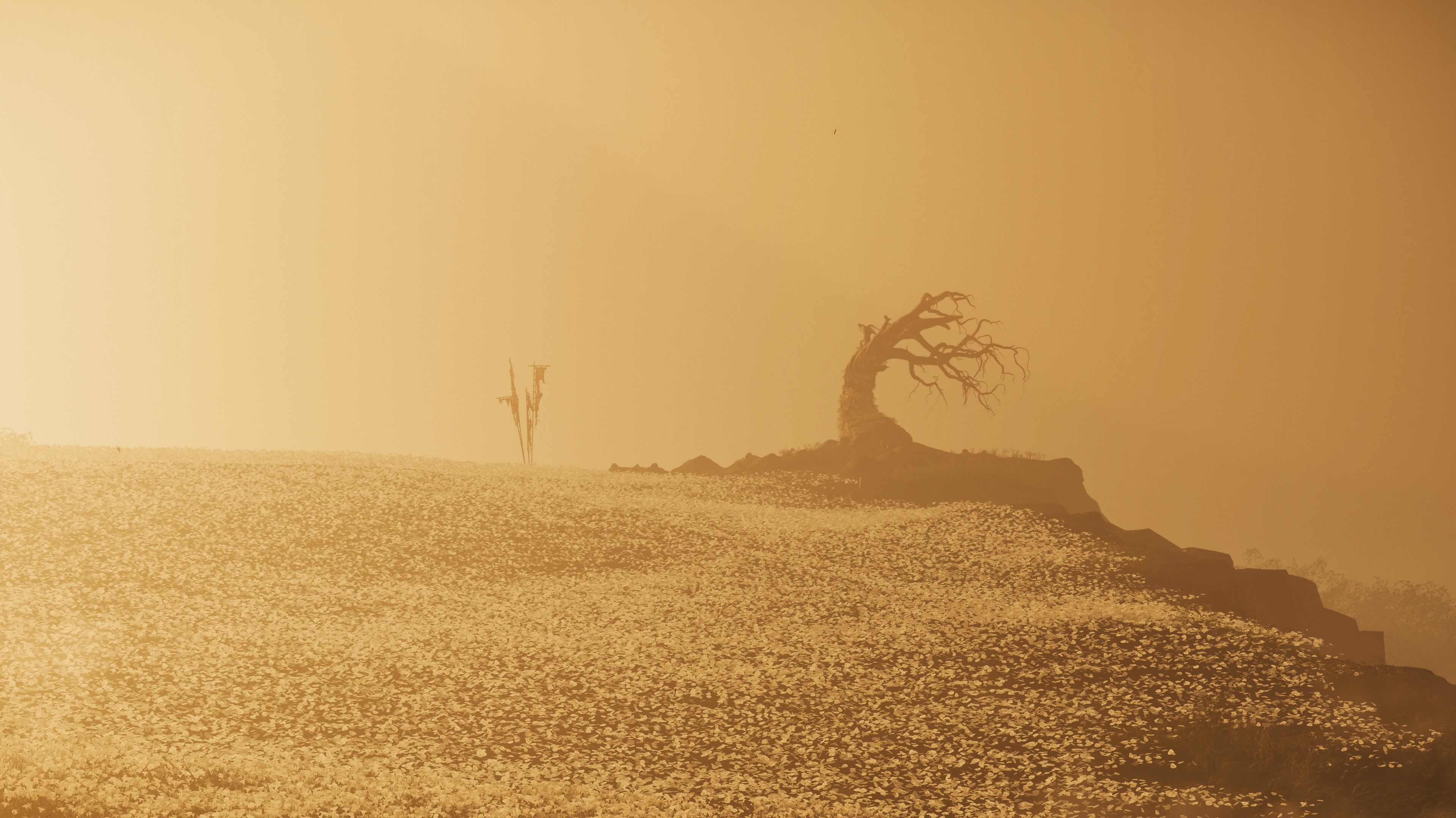 The second shot is the exact same instance, but using my own advice to pan the camera round to test a different composition, removed particles and changed time of day to golden hour.