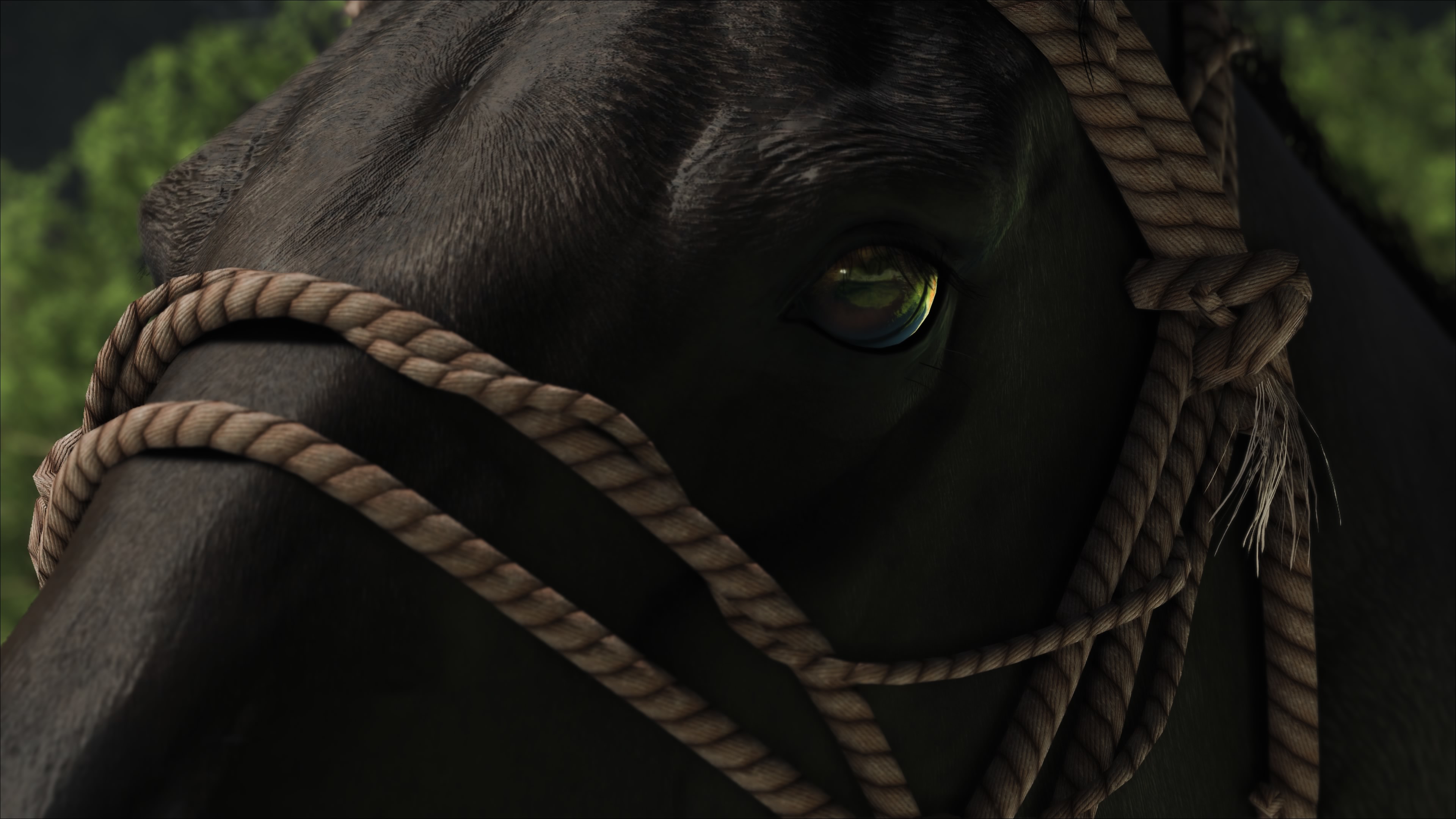 In the first image, we went with a wide focus (24mm or so) to capture the size of the galloping herd and used a Dutch Angle to add a sense of energy. Leaf particles suggested debris being kicked up by hoofs. One mistake I made: I should have chosen Violet Petals as Particles to keep consistent with the flowers in the field.