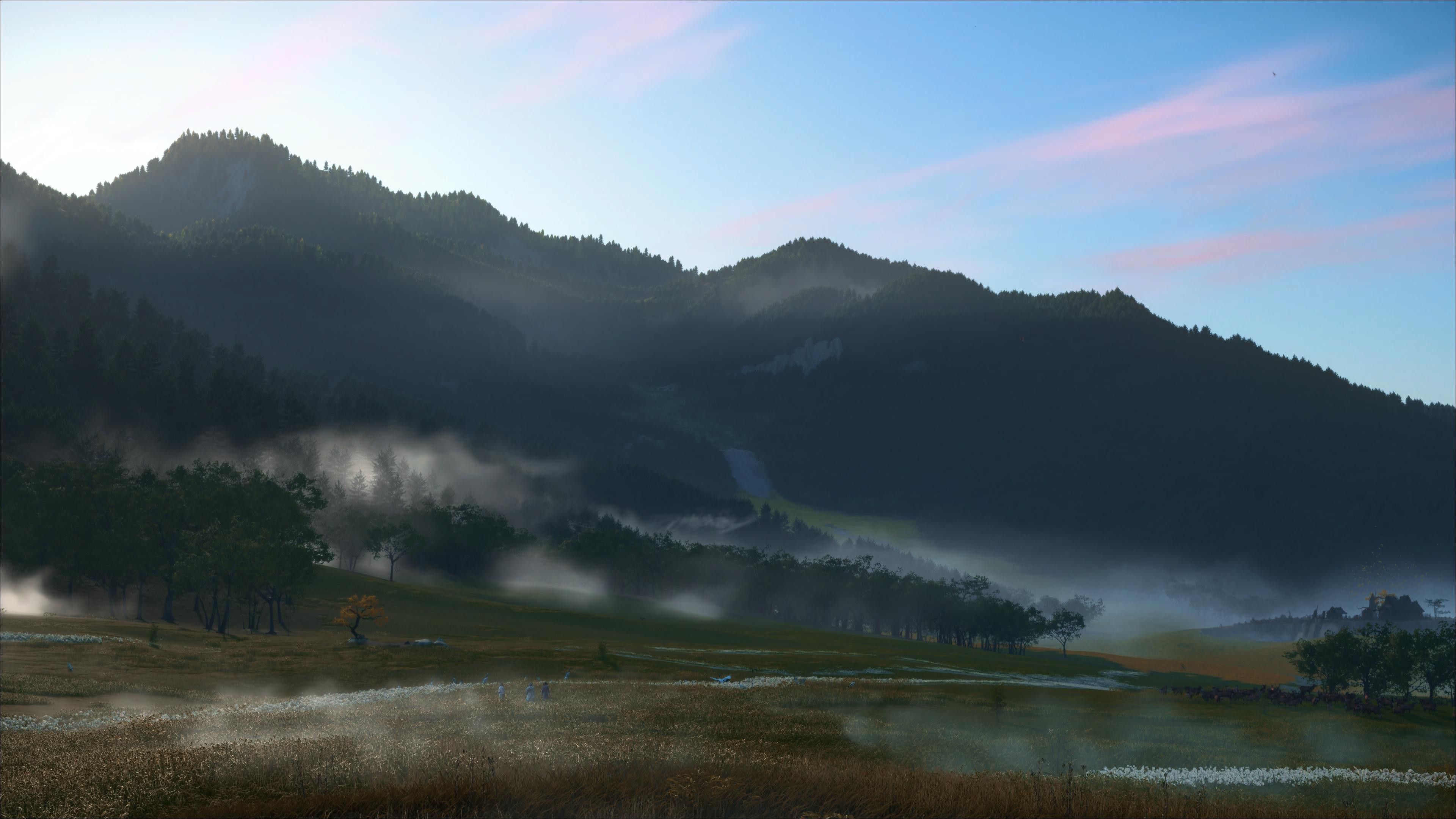 I wanted to highlight the figures in the bottom left to better emphasize the scale of this landscape. I could alter the time of day to find a point when their stretch of field was flooded with sunlight. But a quick colour grade switch gave the area the pop I needed.