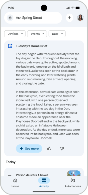 The Google Home app’s Activity tab showcases the activity history for your entire home, including devices that are not made by Google or Nest. At the top of the tab is a new AI-powered “Home Brief” feature, which uses Gemini to summarize things that happened in the home that day, saving you from reading through hours of alerts and events.