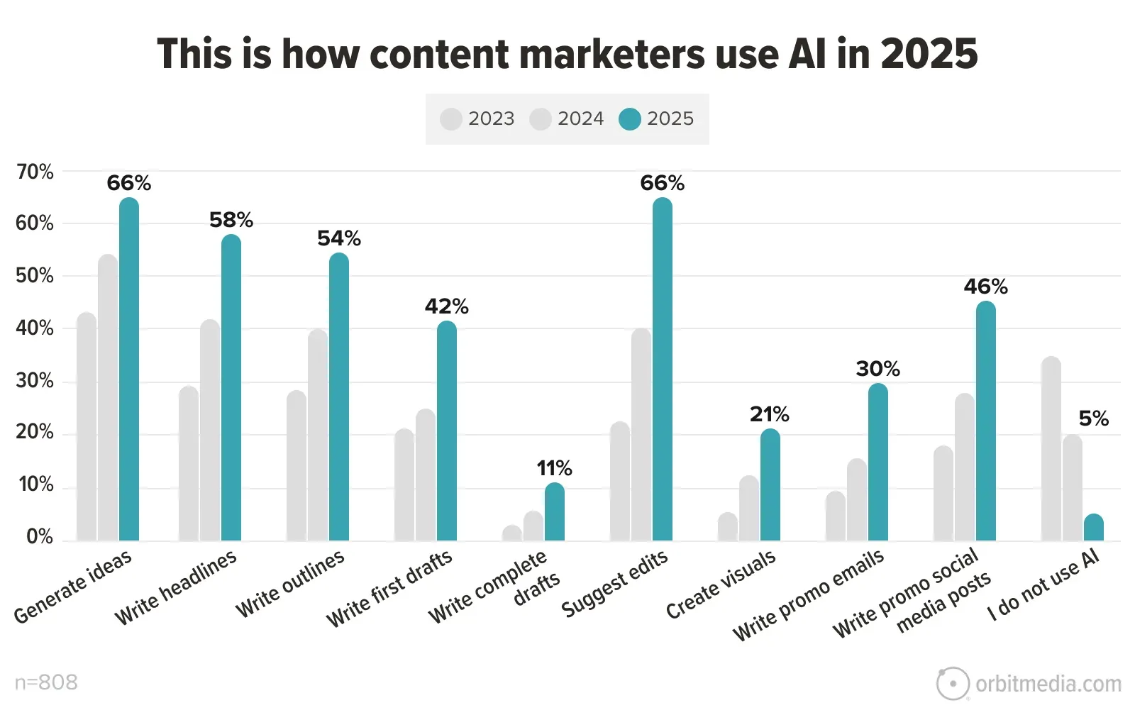 Two years ago, most marketers hadn’t touched AI. In 2025, nearly all have. Only about five percent still work without it. The majority use AI to brainstorm, outline, or clean up text. Few trust it to write entire posts.
