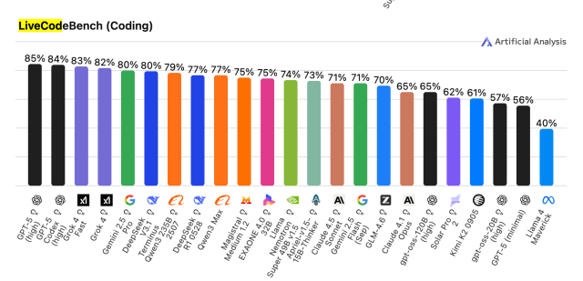 Programming is another area where it’s wise to tread lightly when using Llama. That’s because Llama might — perhaps more so than its generative AI counterparts — produce buggy or insecure code[16]. On LiveCodeBench[17], a benchmark[18] that tests AI models on competitive coding problems, Meta’s Llama 4 Maverick model achieved a score of 40%. That’s compared to 85% for OpenAI’s GPT-5 high and 83% for xAI’s Grok 4 Fast.
