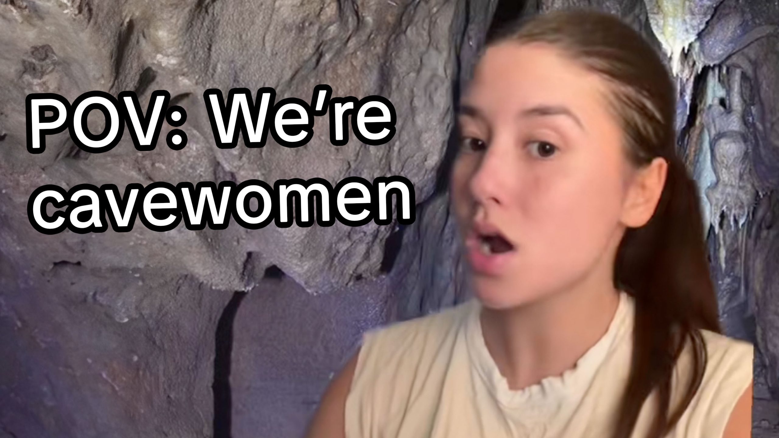 POV: We’re Cavewomen and I’m Telling You About My Ex, also known as the Cavewomen Trend, Cavegirls Trend or Talking Like a Cavewoman Trend, refers to a series of videos, a part of a TikTok[1] trend, in which women talked like a cavewoman (or a cavegirl) when telling a story about their lives. The aforementioned POV[2] catchphrase[3] was the most common caption for the videos, in which the female TikToker told a story about their ex-boyfriend or husband while speaking like a cavewoman. The dialect involves using “me” in place of “I” and other possessive, first-person pronouns, among other humorous simplifications of speech meant to sound primitive.