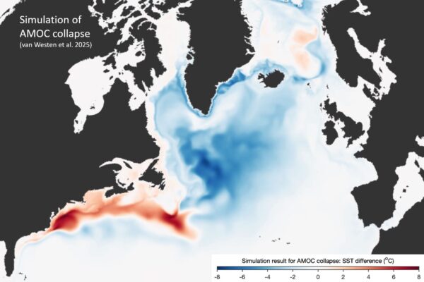 Figure 1. Sea surface temperature change pattern caused by the AMOC shutting down in a high-resolution ocean model. This is a pure AMOC effect without any greenhouse-gas climate change. We see the famous blue ‘cold blob’ due to less heat being brought to the northern Atlantic, and also in red the northward Gulf Stream shift, an ocean dynamics effect of weakening AMOC (Zhang 2008[8]). Source: van Westen et al. 2025[9]., mapped by Ruijian Gou.