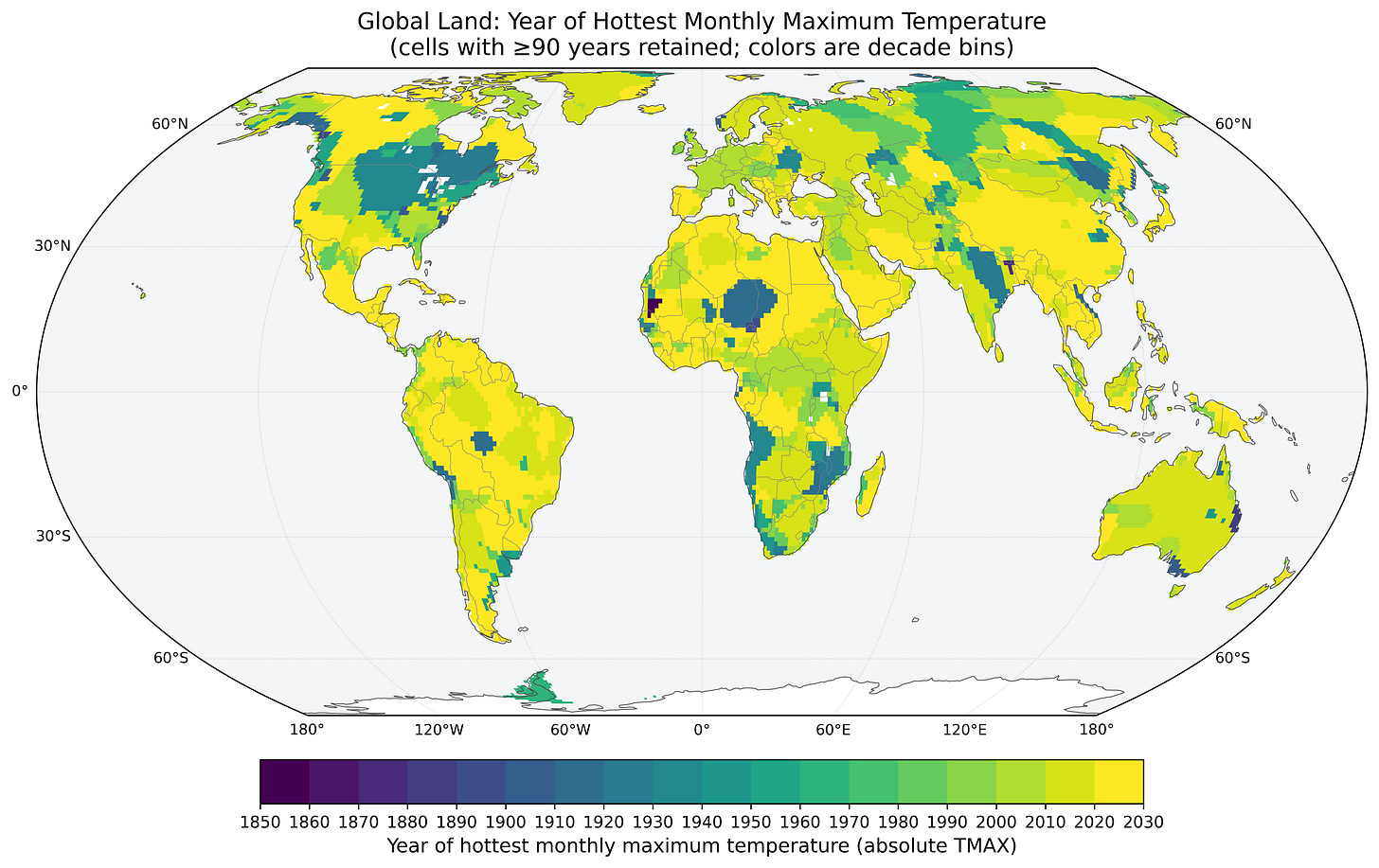 Here we see that much of the world set a maximum monthly TMax temperature in the 2000s, 2010s or 2020s. There are a few regions – central North America, central and southern Africa, western India, etc. – that saw records set earlier, but this is not unexpected due to regional temperature variability (e.g. weather).