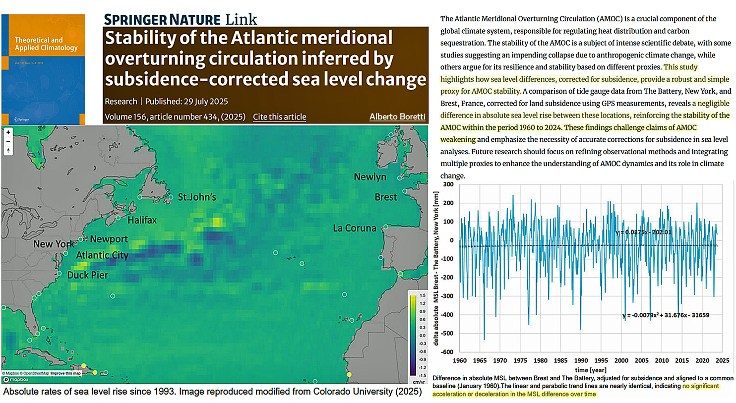 “…a negligible difference in absolute sea level rise between these locations [The Battery, New York, and Brest, France] reinforces the stability of the AMOC within the period 1960 to 2024. These findings challenge claims of AMOC weakening.”