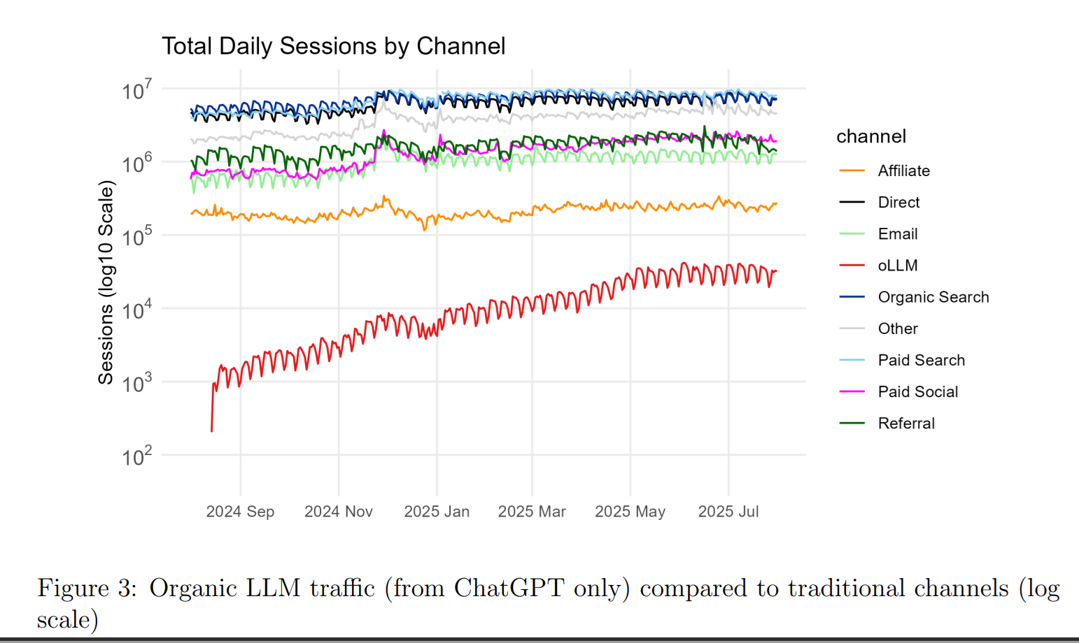 Retailers are receiving more visitors from ChatGPT when users ask about products and follow its links to ecommerce pages. However, the share is still very small. The study analyzed[1] first-party analytics from 973 online stores with 20 billion dollars in combined revenue and found that ChatGPT accounted for about 0.2 percent of all sessions, roughly two hundred times smaller than organic Google Search volumes according to the working paper. Traffic from other large language models such as Gemini, Perplexity, and Copilot appeared negligible in comparison.