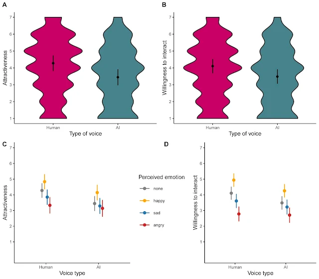 Across every emotion, listeners favored the real speakers. Human voices came across as warmer and more appealing, with higher ratings for attractiveness and the desire to interact. Synthetic voices, even when delivered smoothly, still lagged behind. The emotional tone mattered a lot. Happy voices got the best scores, while sad and angry ones fell to the bottom. So whether a voice comes from biological vocal cords or a neural network, positivity still pays.