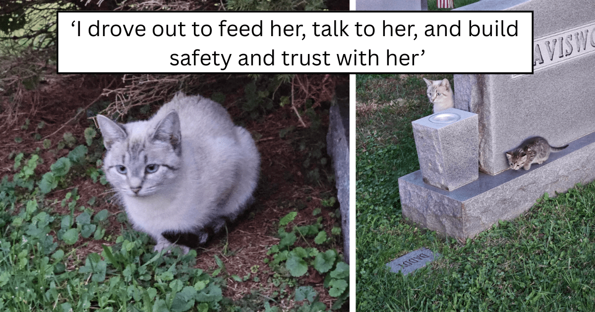 Sometimes, the Cat Distribution System[1] delivers in the most unexpected places. While checking on a quiet cemetery, this caretaker discovered a tiny, furry mystery. A carrier, four kittens, and one frightened mama cat. The kittens wasted no time claiming their new hooman, climbing pant legs and hearts alike. Mama, however, had clearly seen hard times and wasn’t ready to trust just yet.