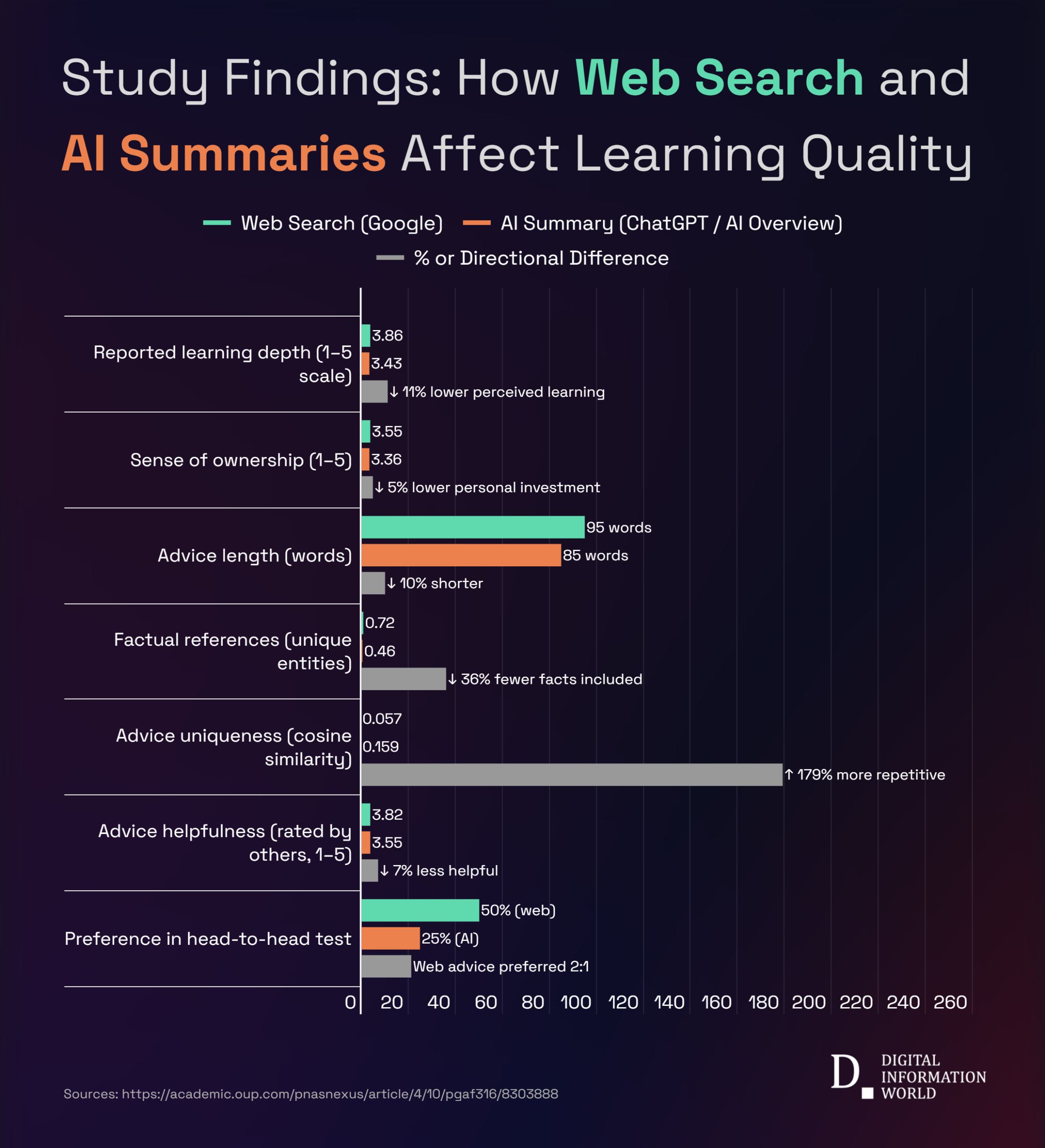 A second experiment used simulated versions of both interfaces to ensure identical information was presented in both cases. Even when the underlying facts were the same, the differences persisted. People who saw a ChatGPT-style summary spent less time reading, felt they learned less, and produced briefer, less factual advice than those who browsed articles through web links.
